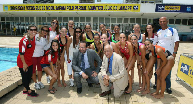Na cerimônia de reabertura do parque, estiveram o Presidente da Confederação Brasileira de Desportos Aquáticos, Coaracy Nunes Filho; o Secretário Estadual de Esportes e Lazer e Presidente da Superintendência de Desportos do Estado do Rio de Janeiro (Suderj), André Lazaroni; o procurador federal André Odarcigy; o Diretor Executivo da CBDA, Djan Madruga; o Diretor Jurídico da CBDA, Marcelo Franklin, a viúva do jornalista Julio de Lamare, Miriam de Lamare, e sua filha, Cláudia, além de atletas do passado (como a ex-nadadora Maria Elisa Guimarães, nossa representante na Olimpíada de 1976 em Montreal e que participou da inauguração do parque, em 1978) e do futuro, como os nadadores Natália Almeida, Thais Xavier e Luiz Altamir Mello. Coaracy comemorou muito a permanência do local e desfilou com um documento do Iphan, datado de agosto, que afirma a proibição da demolição do parque.
